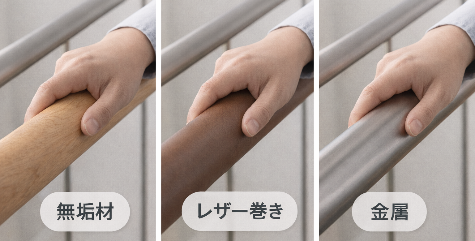 無機質な金属ではなく「無垢材」や「レザー巻き」の手すりを採用し