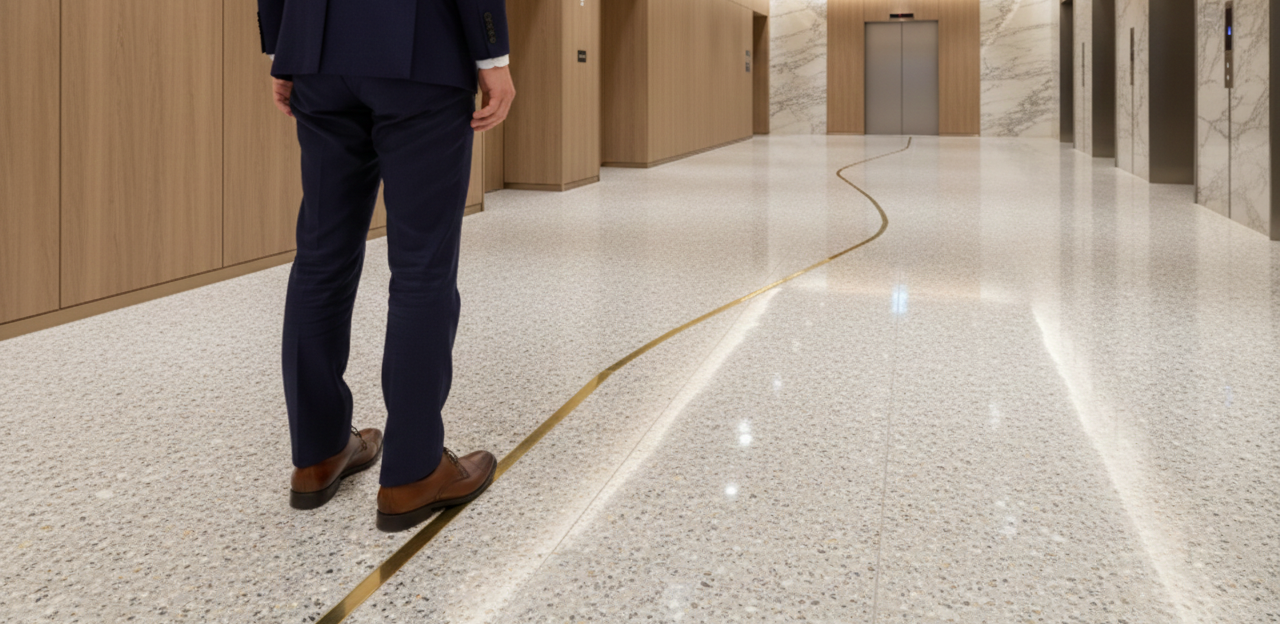 床に「真鍮の見切り材」を埋め込むなど、看板に頼らない