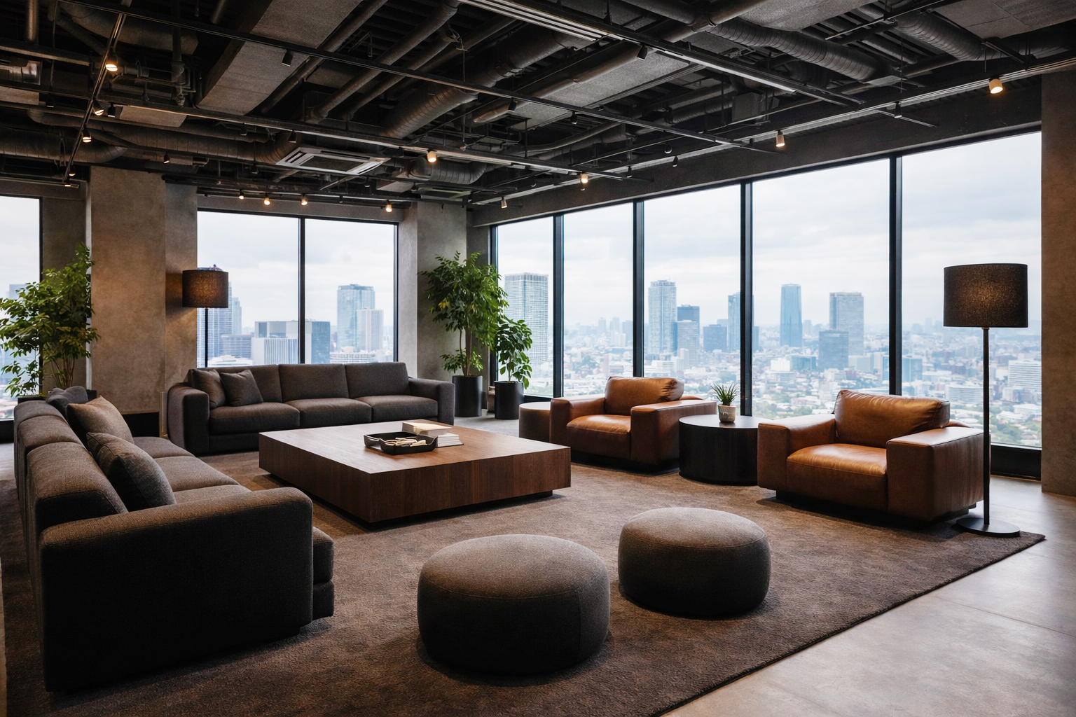 スケルトン天井などの高い空間では、あえてボリュームのある家具を選び