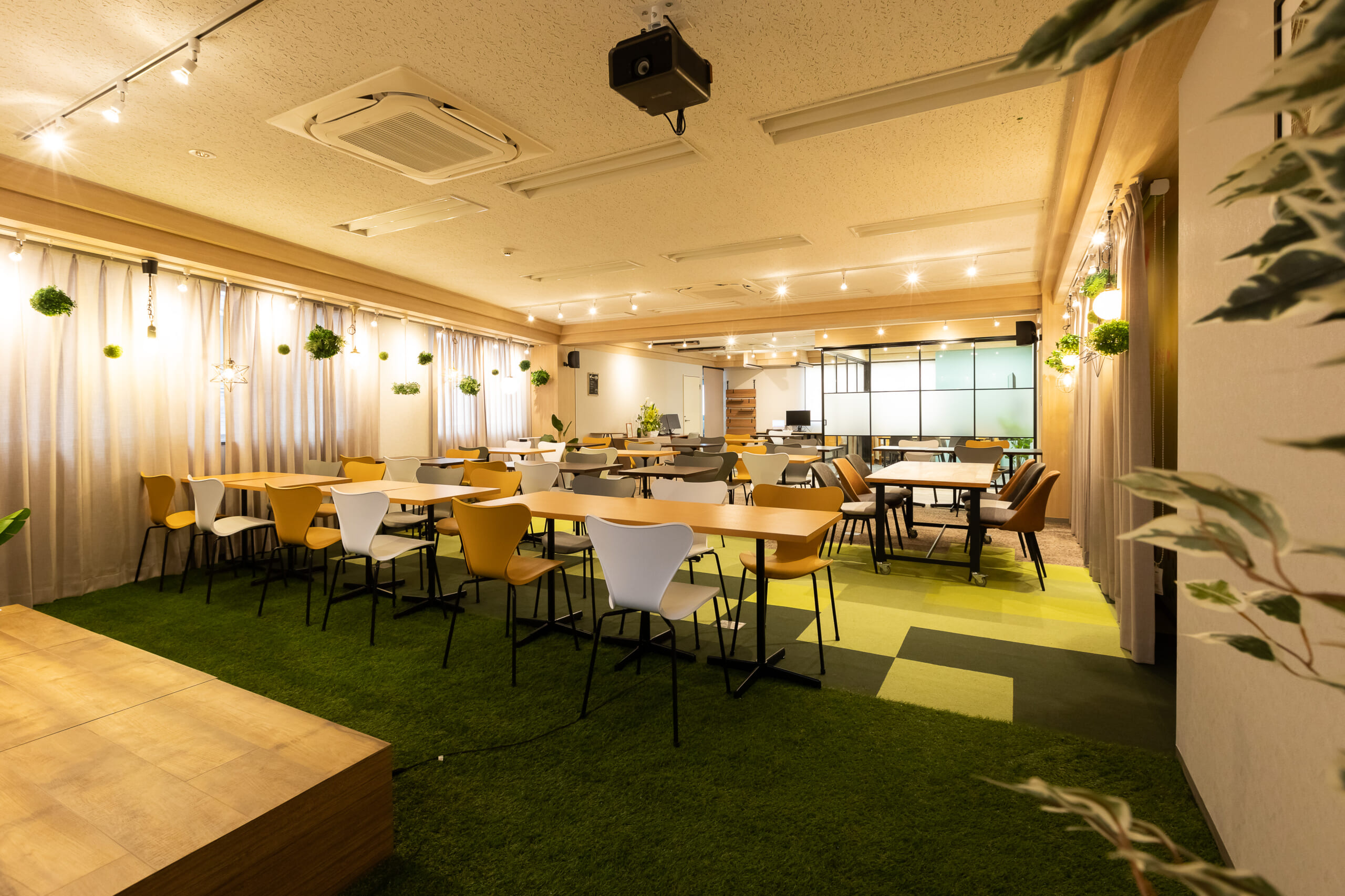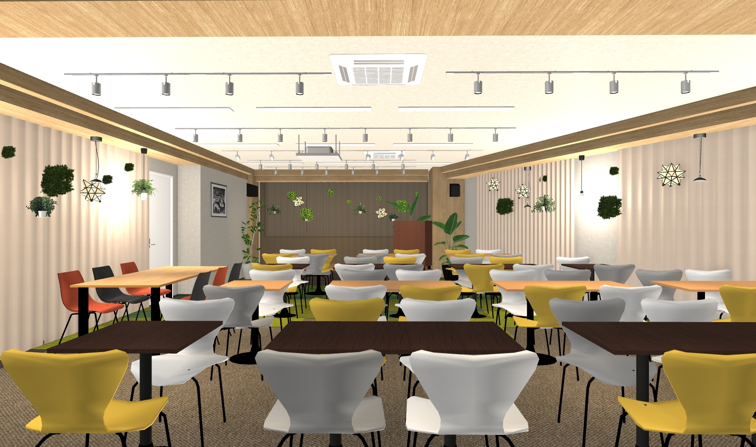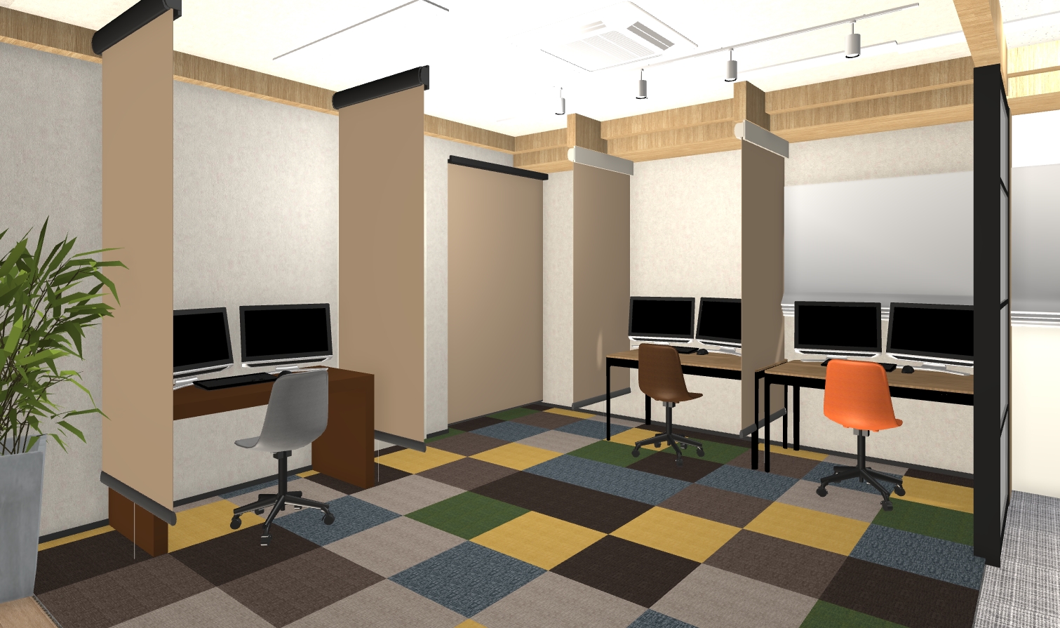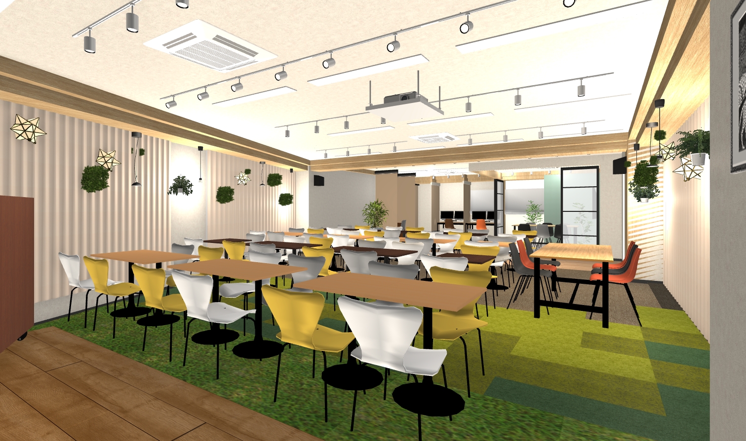 ①可変性のある柔軟に、デスクを移動しレイアウトを変更できる演出 ②照明の演出:様々な照明器具で装飾としても楽しめる演出 ③色合いをあえて変えて、楽しさや動きを演出