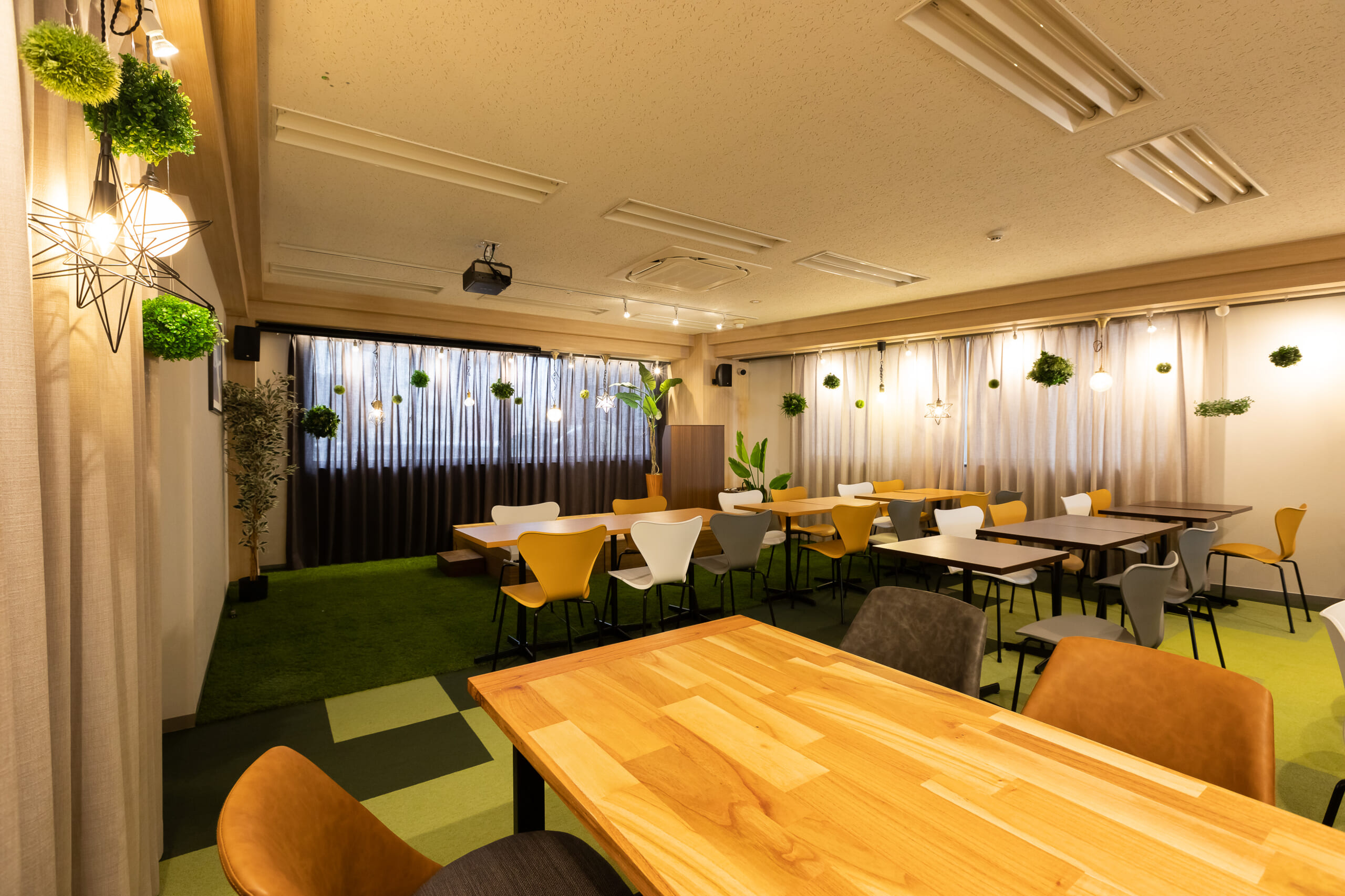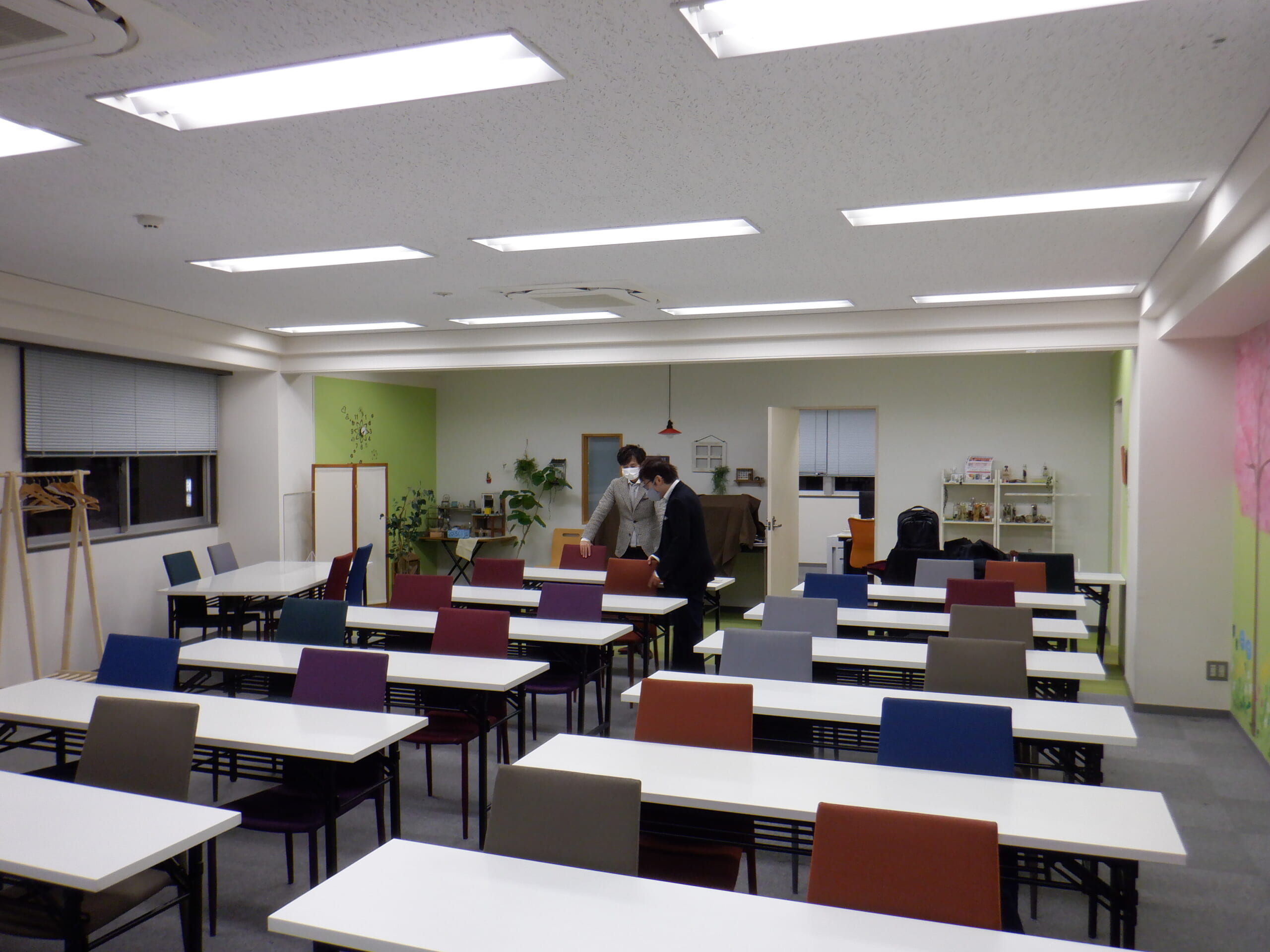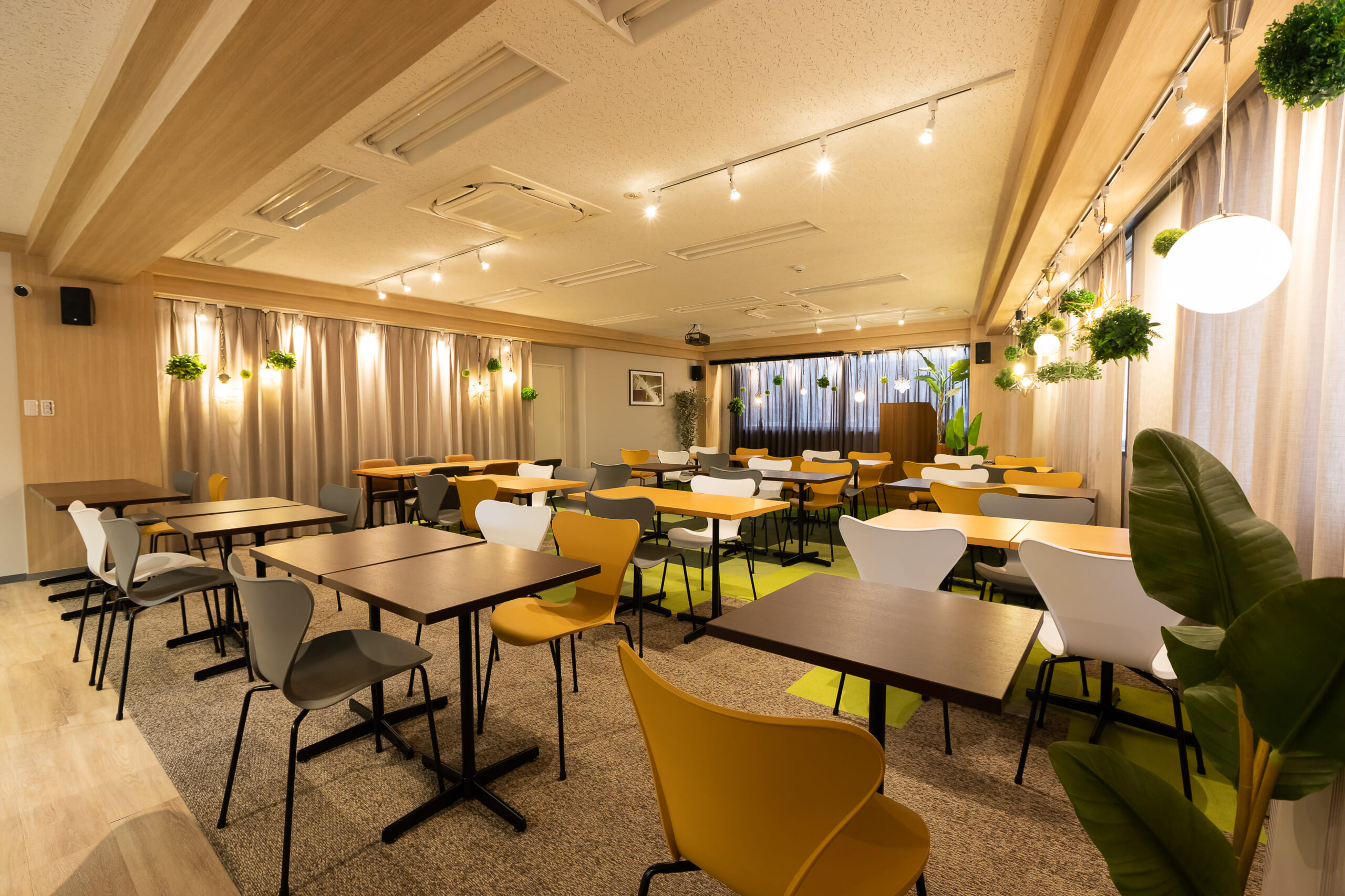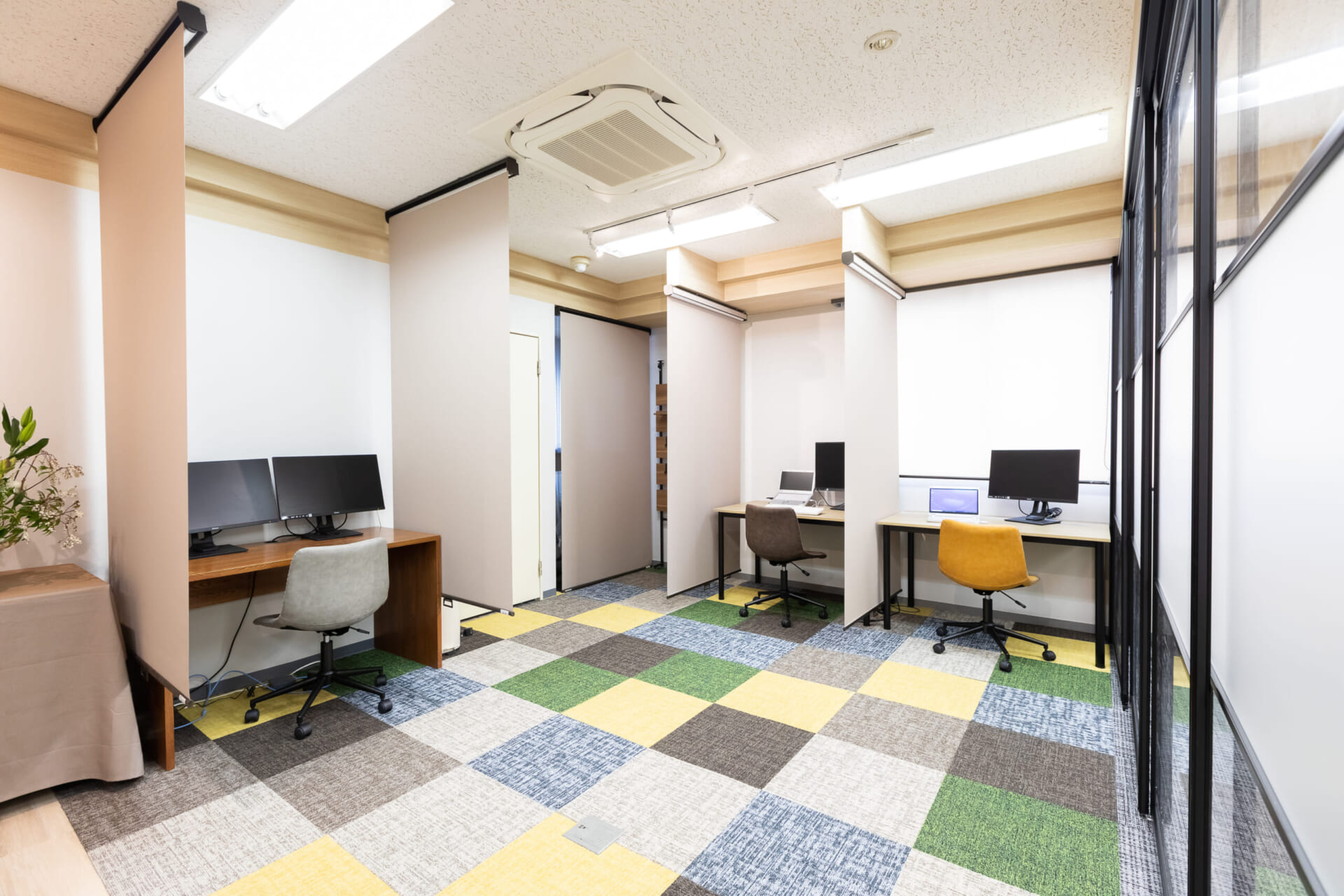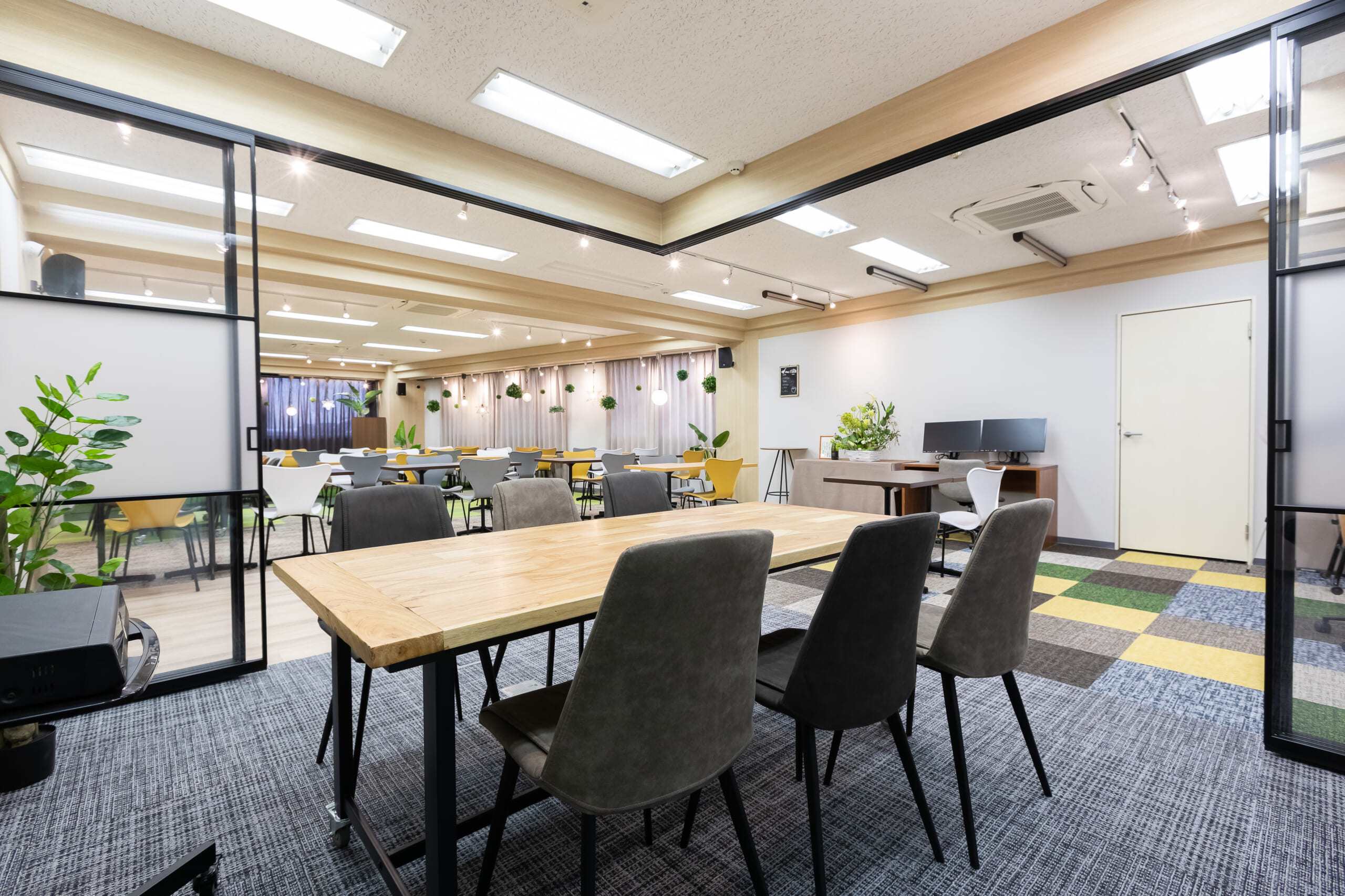 ①可変性のある柔軟に、デスクを移動しレイアウトを変更できる演出 ②照明の演出:様々な照明器具で装飾としても楽しめる演出 ③色合いをあえて変えて、楽しさや動きを演出