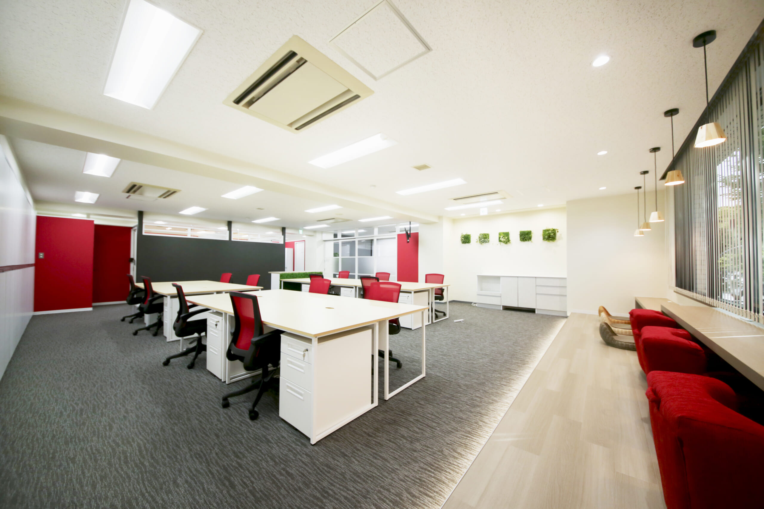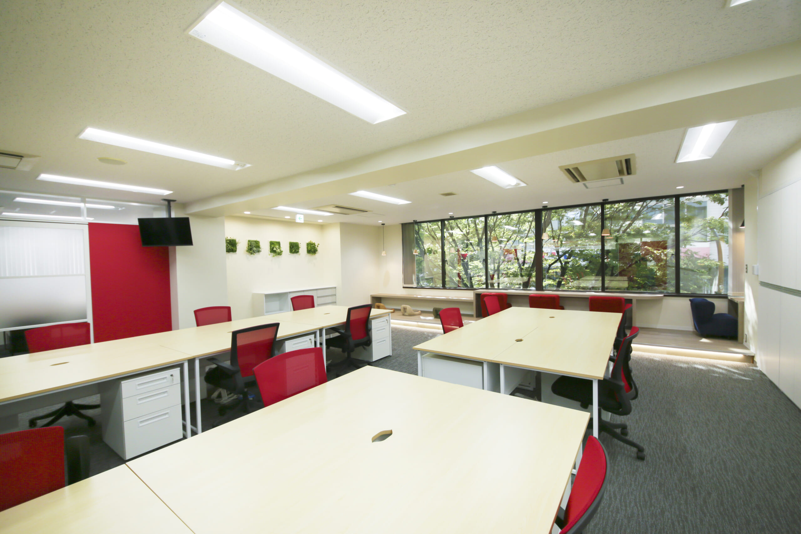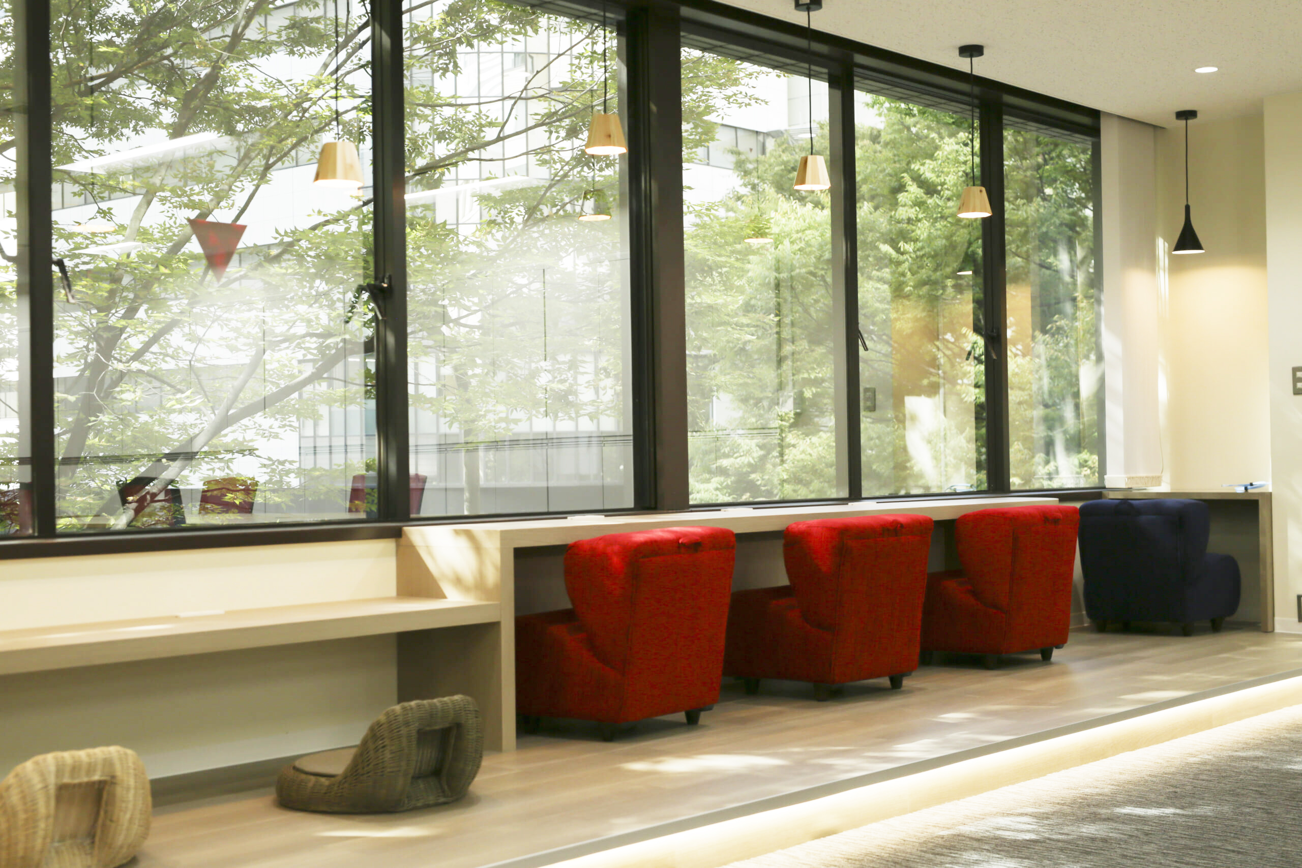 お客様が入った瞬間に気分が上がるエントランスや打合せコーナーをコーポレートカラーの赤と白を使ってデザインしました。 また、リフレッシュしたいという社員の方の意見が多かったため、街路樹の緑を眺められるコーナーを設け床を上げることで意識的に空間を分けています。