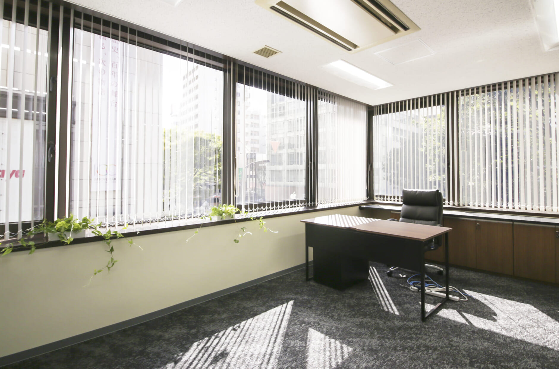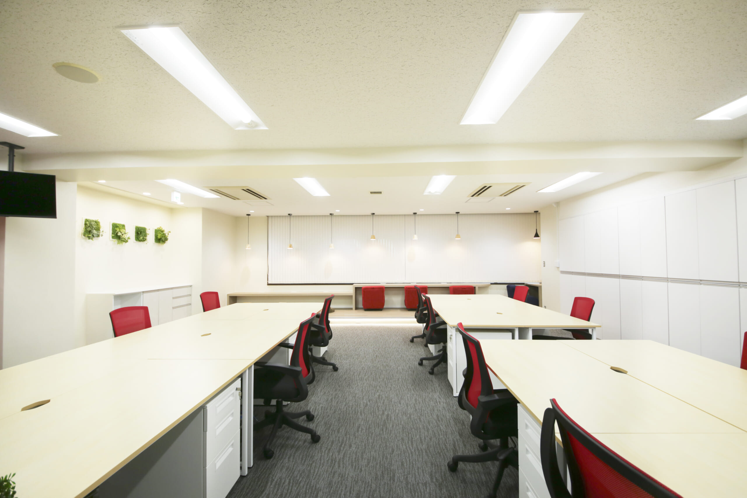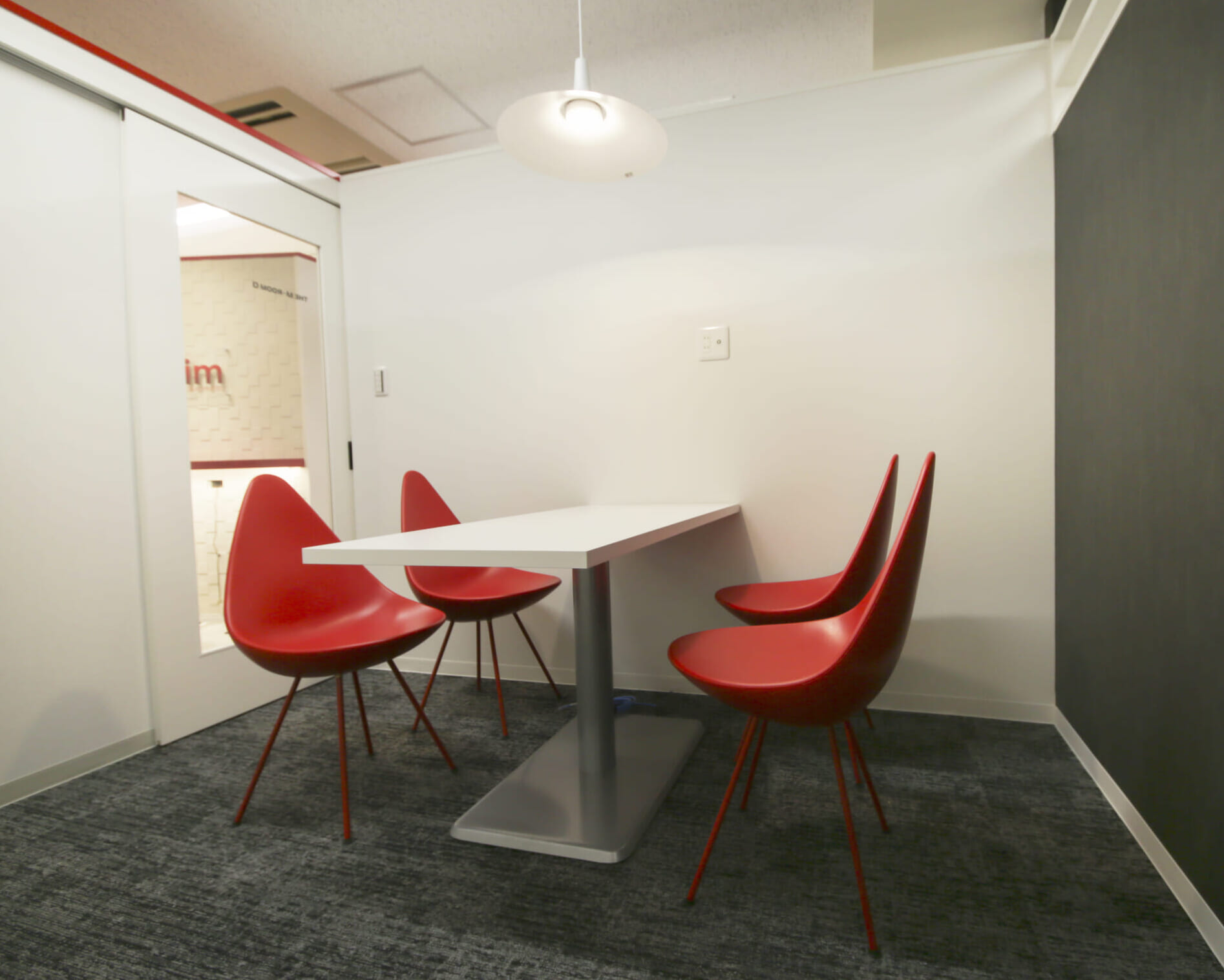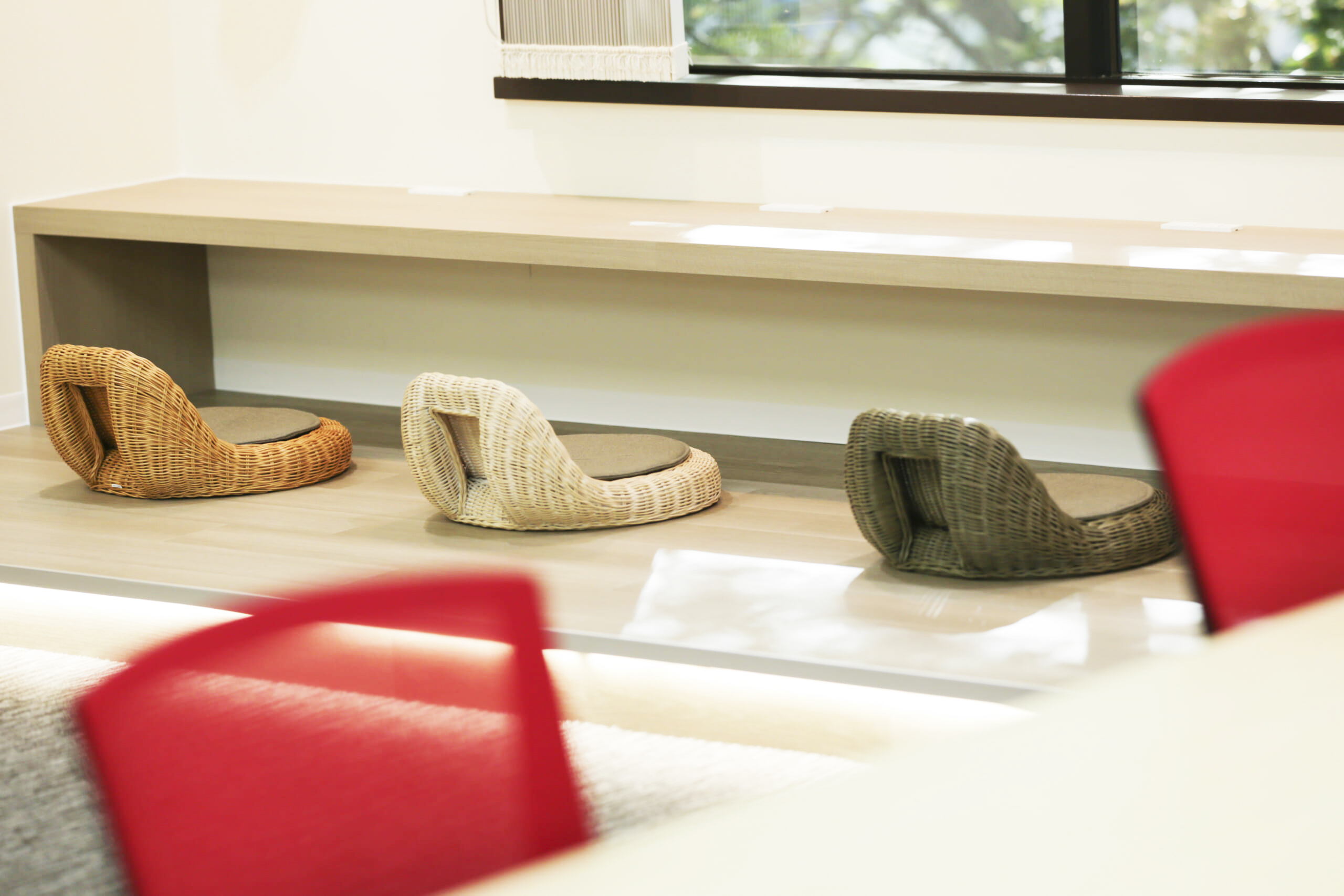 お客様が入った瞬間に気分が上がるエントランスや打合せコーナーをコーポレートカラーの赤と白を使ってデザインしました。 また、リフレッシュしたいという社員の方の意見が多かったため、街路樹の緑を眺められるコーナーを設け床を上げることで意識的に空間を分けています。